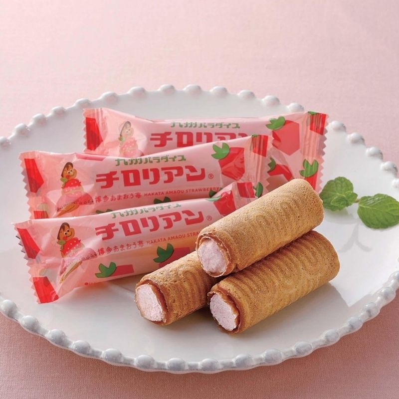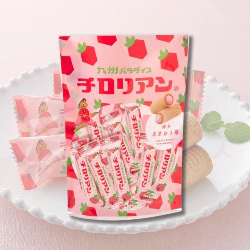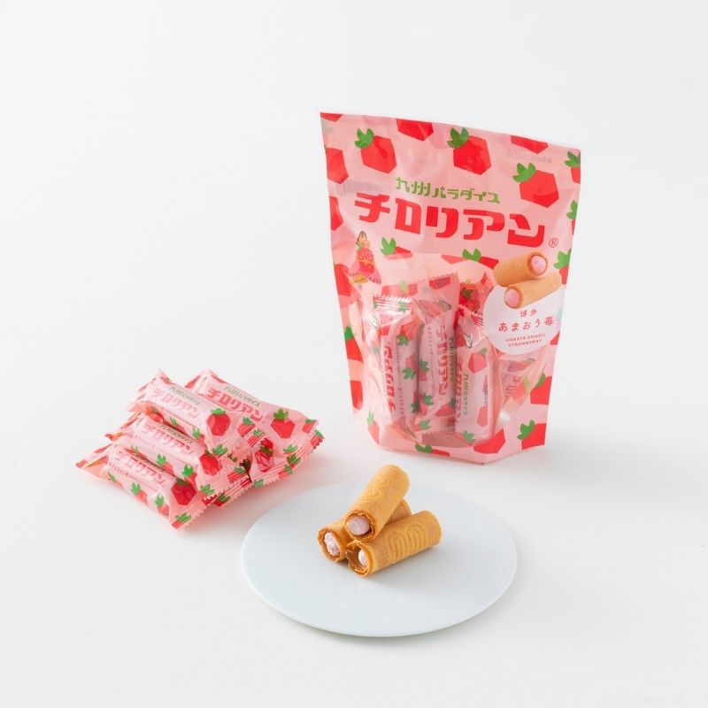 Chirorian dengan rasa mewah yang menggunakan stroberi merek mewah dari Prefektur Fukuoka **"Hakata Amaou"** secara melimpah. Kue gulung dengan tekstur ringan dan renyah ini diisi dengan krim yang menyebarkan aroma manis dan asam stroberi Amaou, benar-benar menghadirkan sensasi "Surga Kyushu".