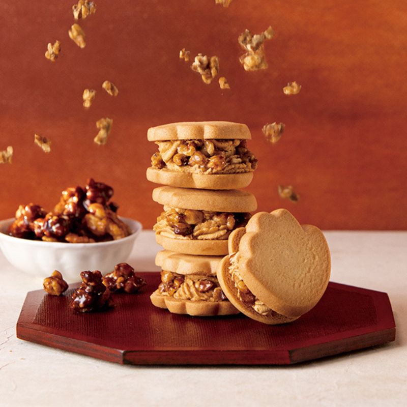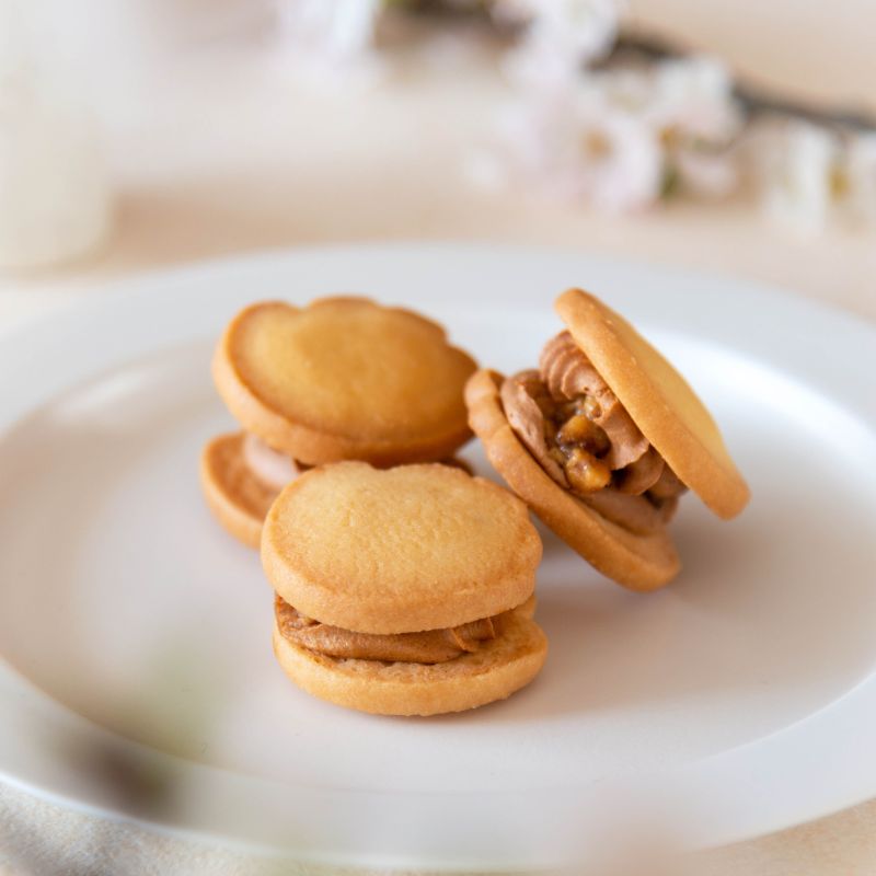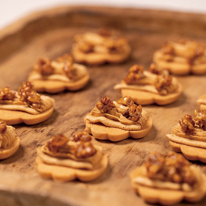キャラメリゼしたくるみのカリカリとした食感と、2層のキャラメルクリームを、厳選したバターを贅沢に使ったかわいい手形のクッキーでサンドしました。キャラメルは、焦げすぎないよう職人が丁寧に火加減を調整しておつくりしています。キャラメル本来の甘さとほろ苦さを感じることでき、濃厚な味わいながら後味のよい甘さに仕上がりました。