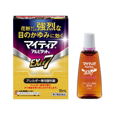 マイティアアルピタットEXα7 アレルギー症状が起こるメカニズムに着目し、抗アレルギー成分・抗ヒスタミン成分・抗炎症成分に角膜保護成分と角膜修復補助成分を加えた、強烈な目のかゆみに効くアレルギー専用目薬です。スイッチOTC成分[クロモグリク酸ナトリウム、プラノプロフェン]を配合しています。 清涼感レベル4 |