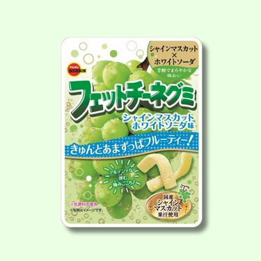 불본의 「페투치네 구미」는 페투치네 파스타를 모티브로 한 롱 형태의 구미 캔디입니다. 샤인 머스캣 맛에는 국산 샤인 머스캣 과즙을 사용해 품종 본래의 화려한 향과 달콤새콤한 맛을 충실히 재현했습니다. 너무 부드럽지도, 너무 딱딱하지도 않은 독자적인 「알덴테 식감」이 특징이며, 씹을수록 포도 맛이 퍼집니다. 2023년 9월 26일에 발매되어 페투치네 구미 시리즈의 과일감이 더욱 향상되었다고 호평받고 있습니다.