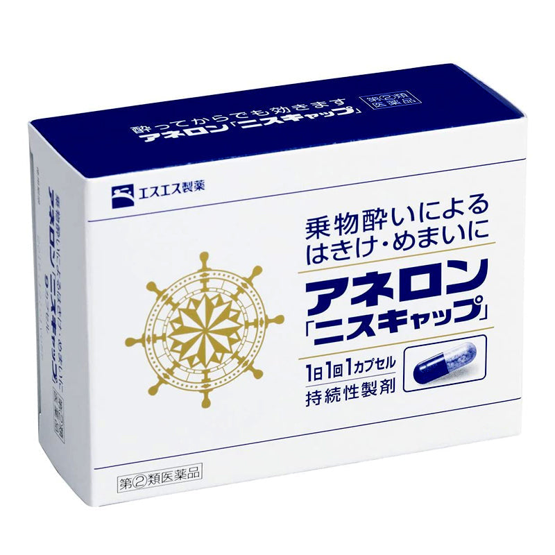 アネロン「ニスキャップ」は、効きめにムラがなく1日1回の服用で長時間効果が持続する持続性の乗物酔い薬です。乗物酔いに効果的な5種類の鎮静・鎮吐 成分が配合されていますので、つらい乗物酔いによる吐き気・めまい・頭痛によく効きます。