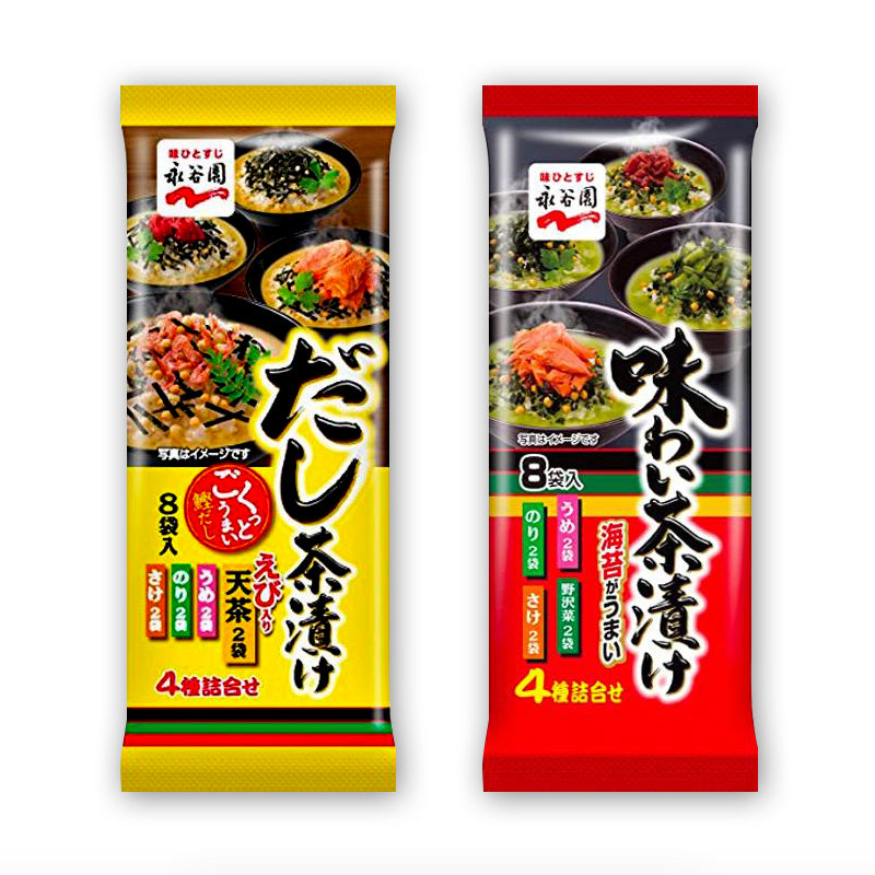 人気の4メニュー「のり」「さけ」「うめ」「野沢菜」が2袋ずつ入っていて、いろいろな味が楽しめます。
