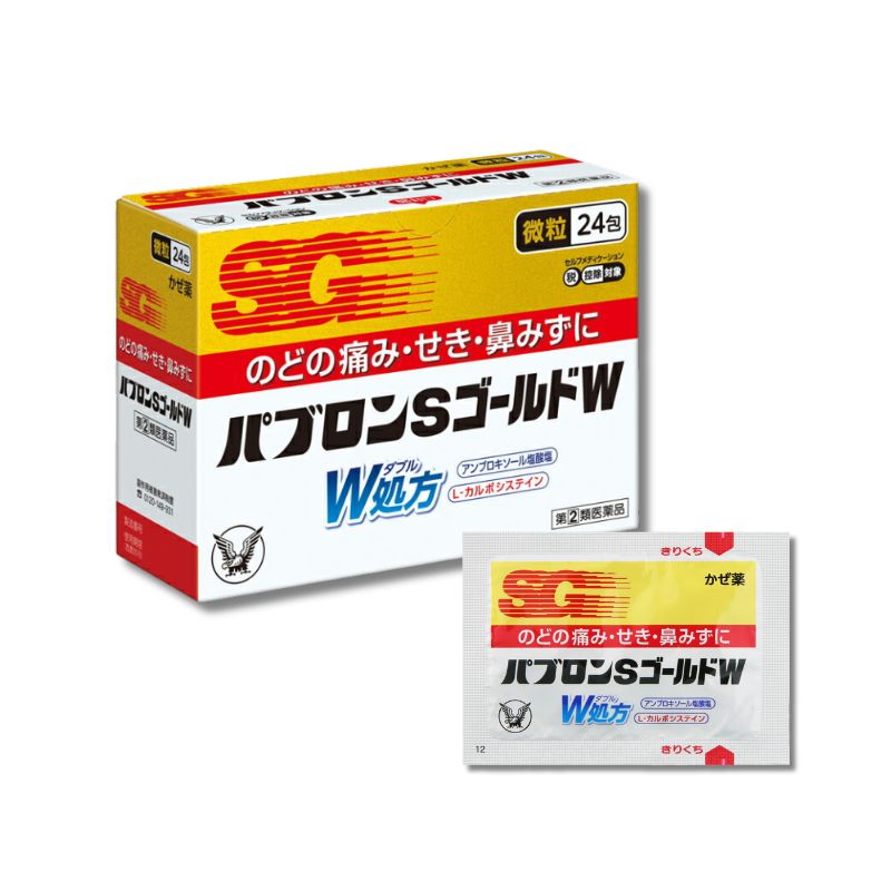 ●パブロンSゴールドW微粒は、気道粘膜クリア成分のアンブロキソール塩酸塩と気道粘膜リペア成分のL-カルボシステインで、気道粘膜バリアをWケアするクリア&リペア®のW処方。のどの痛み、せき、鼻みずなどかぜの諸症状を和らげます。